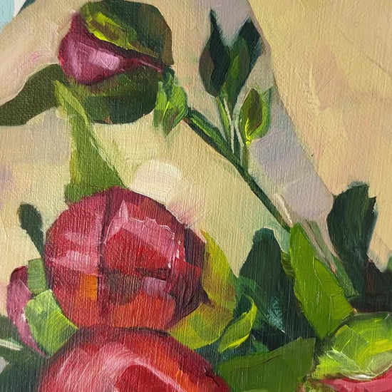"Peonies from the Market" is an oil painting on paper, 19x14 cm. It comes unframed, dated, and signed in the back.